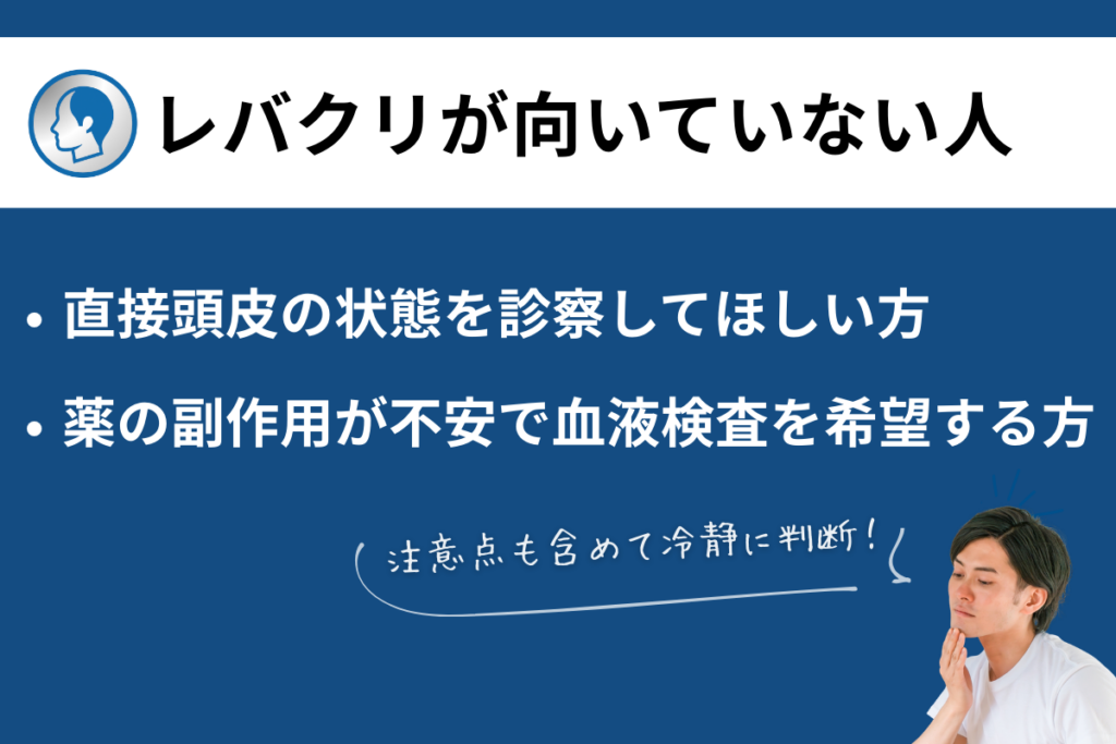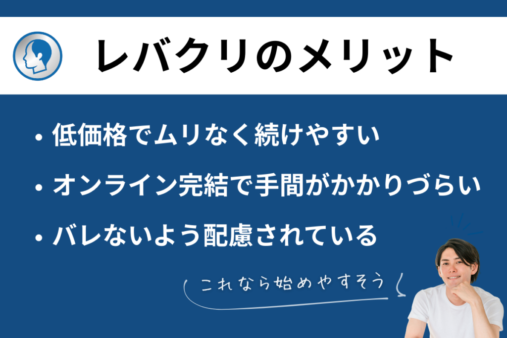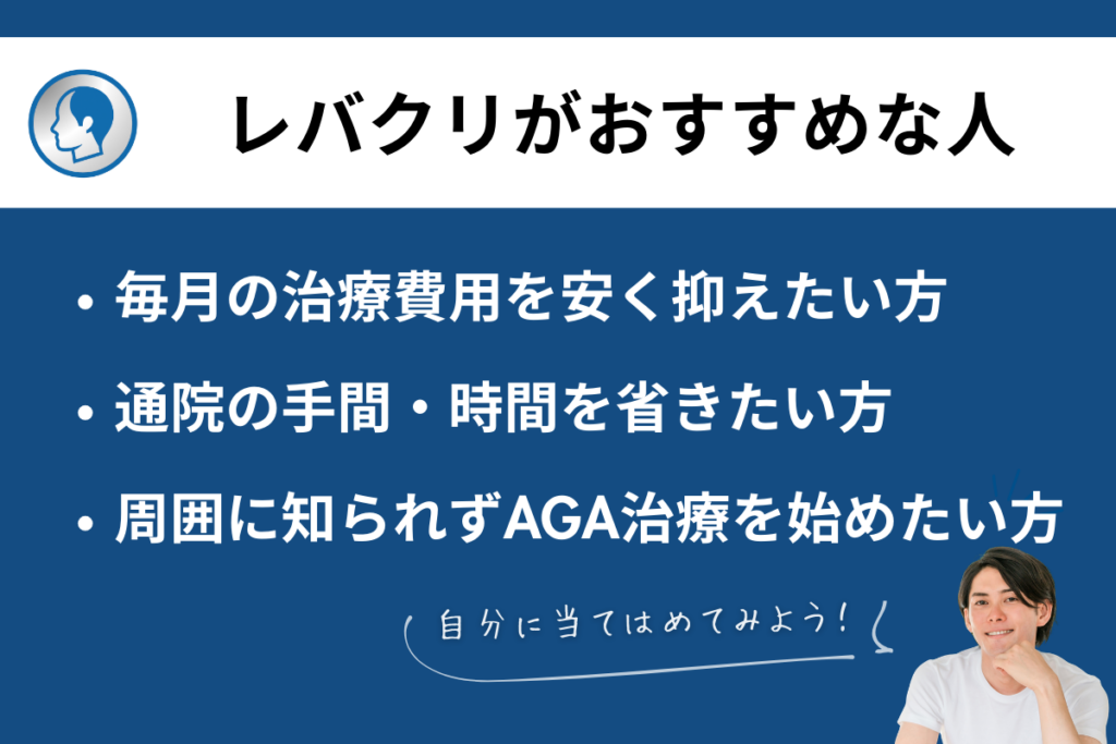 経済的な理由でこれまで治療をためらっていた方にとって、レバクリはAGA治療をはじめる一つのきっかけとなるでしょう。