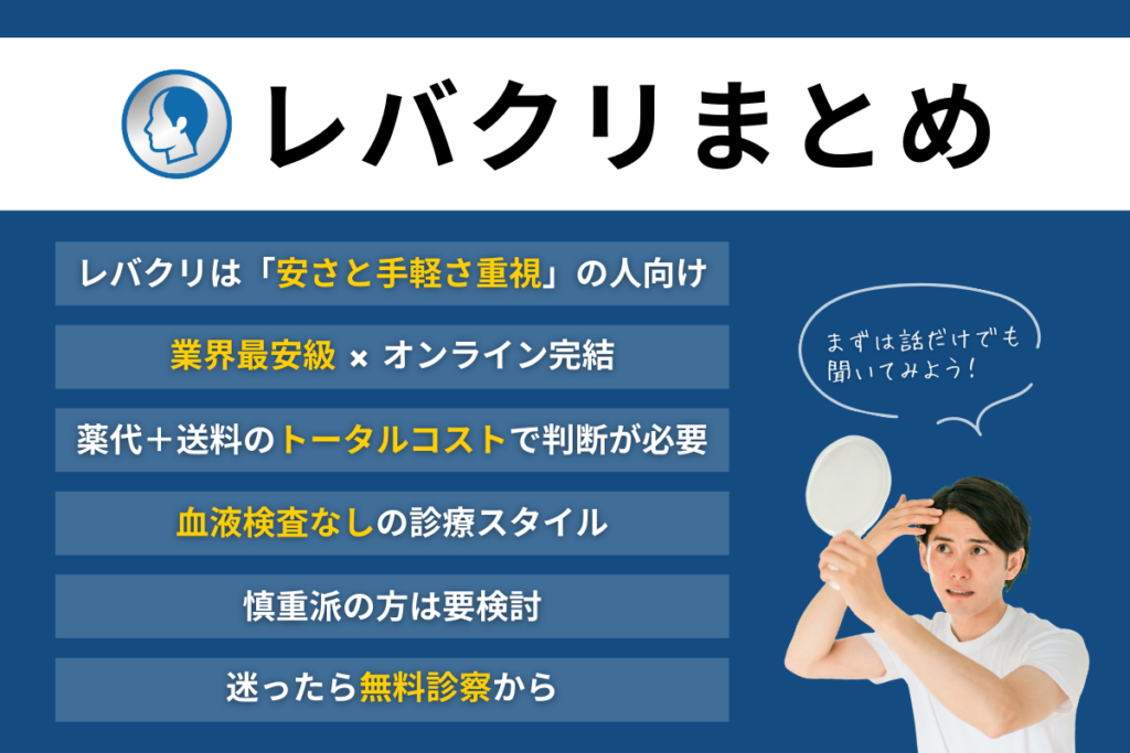 レバクリは、リーズナブルな料金とオンラインで完結する手軽さから、AGA治療を検討している多くの方に注目されています。