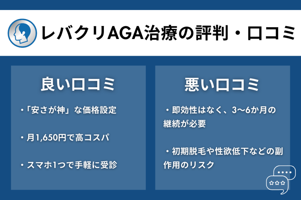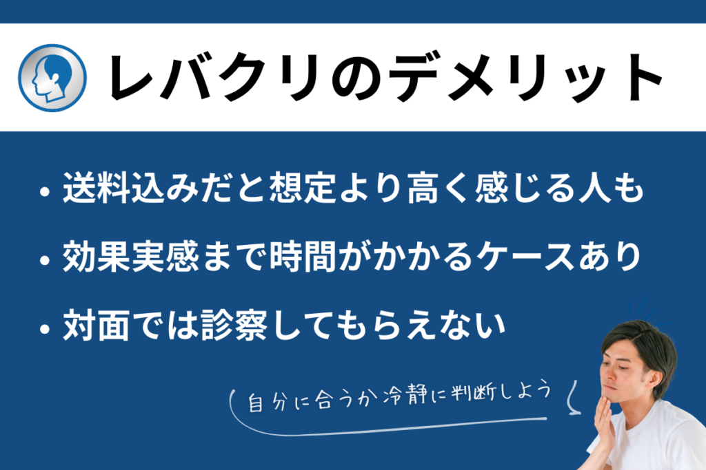 「レバクリのAGA治療が怪しい」という評判も一部には見られますが、オンライン完結への不安や治療費の安さなどが原因と想像されます。