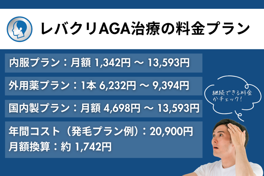 レバクリの発毛プランは、12か月分の内服薬定期配送にすれば、1か月あたり1,650円(税込)からAGAの治療が可能です。