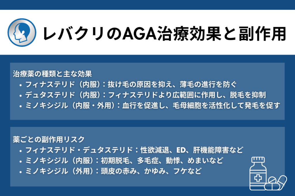 ただし、レバクリはAGA治療の代表的な薬、フィナステリドやミノキシジルなどを用意しており、ほかのクリニックと大きな差はありません。
