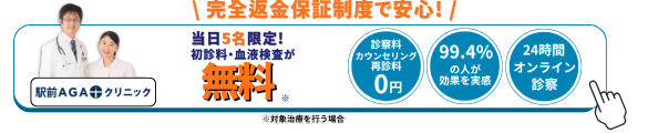 駅前AGAクリニックでは、治療の効果が全く出なかった場合は治療費の返金が受けられます。そのため、効果が出なかった場合に治療費が無駄になる心配をせずに治療が受けられます。